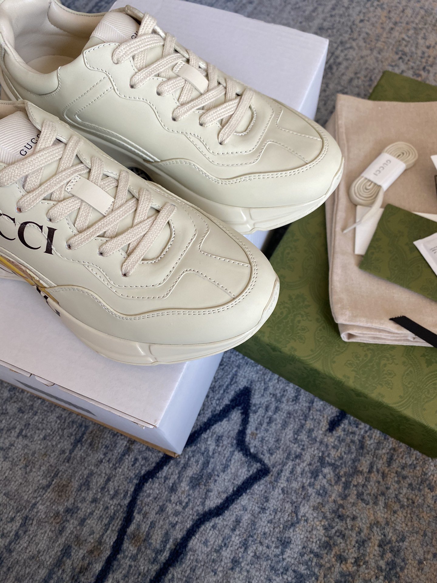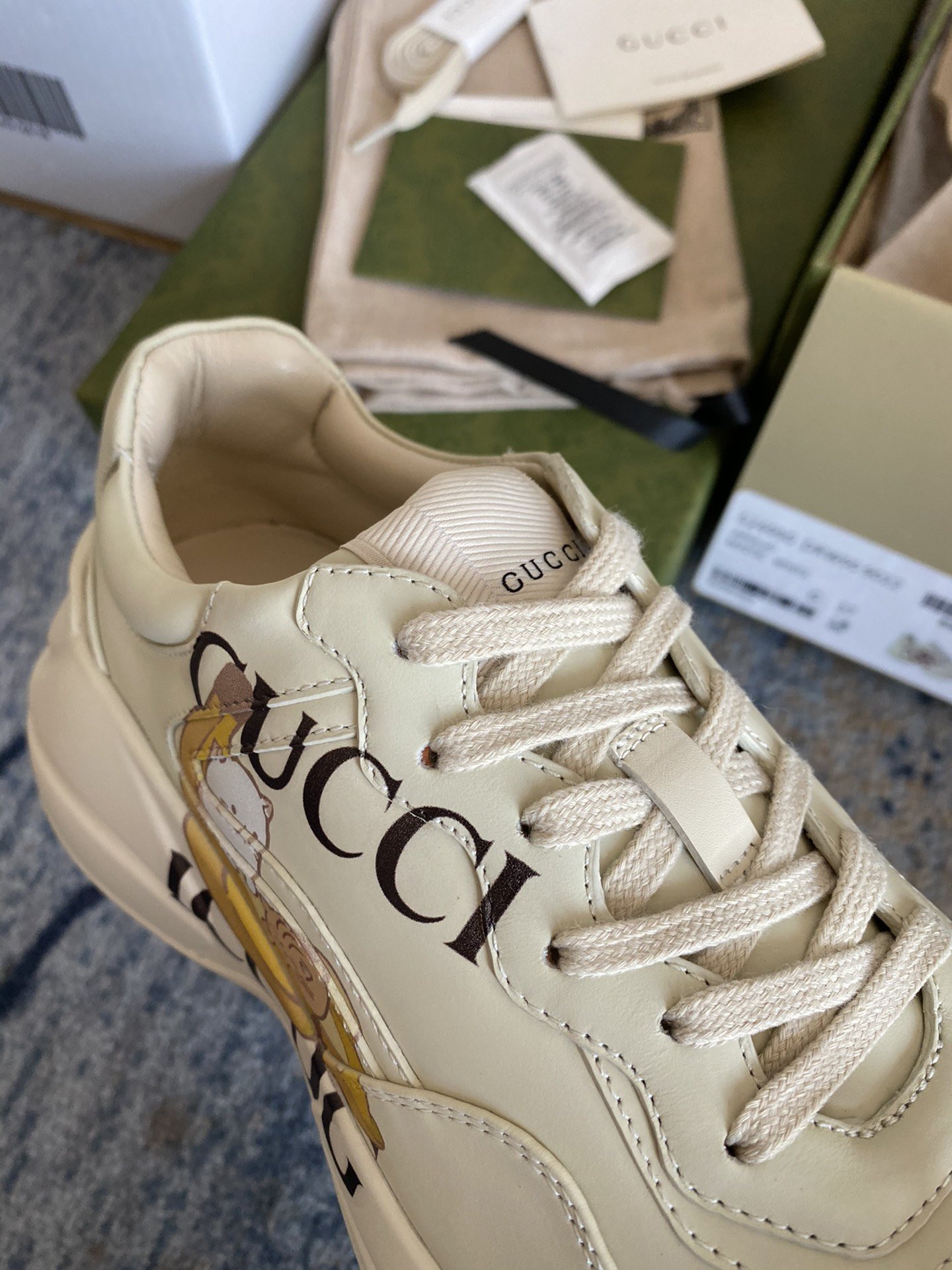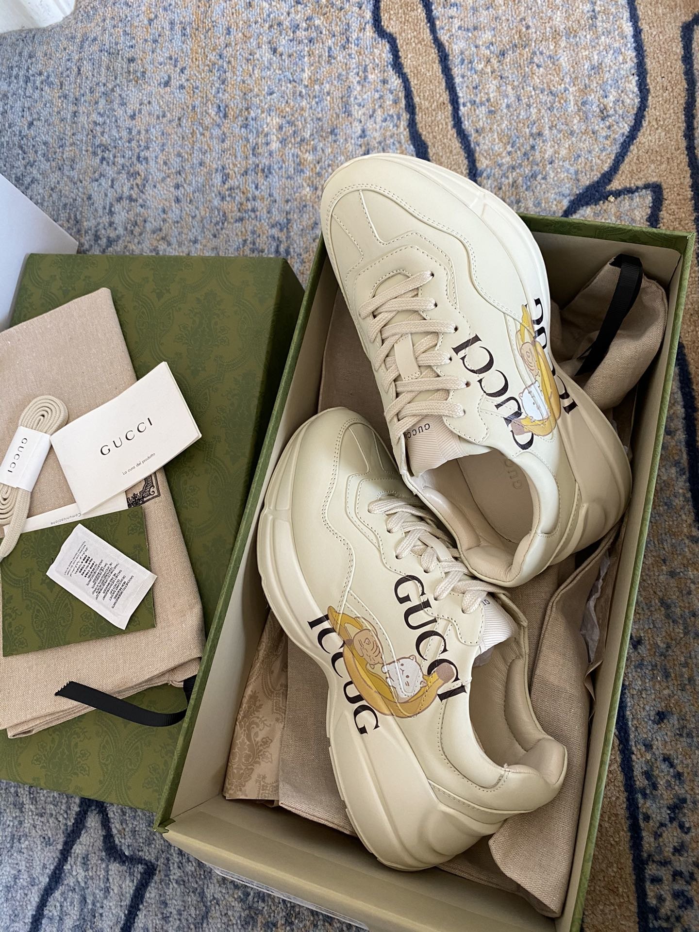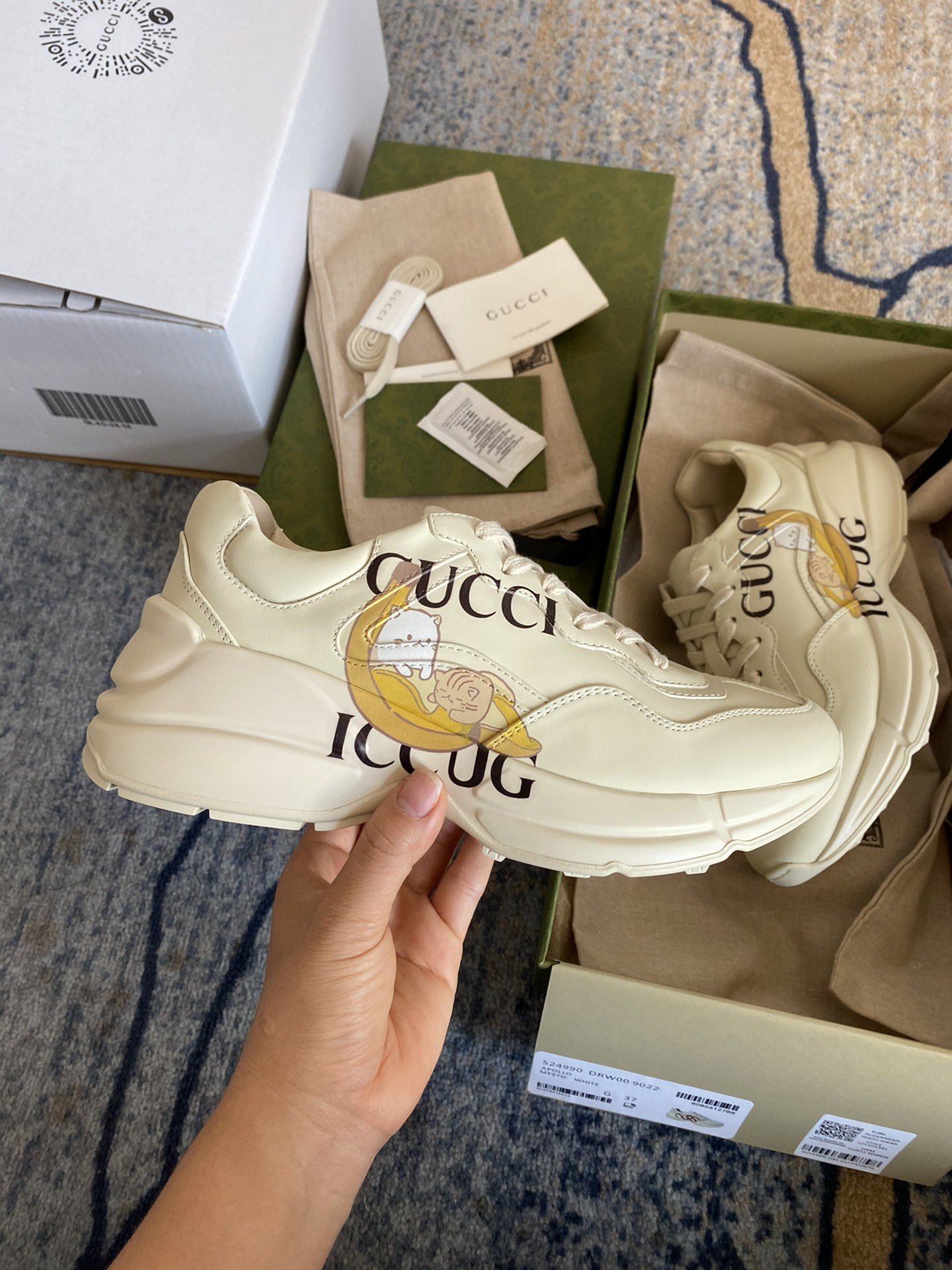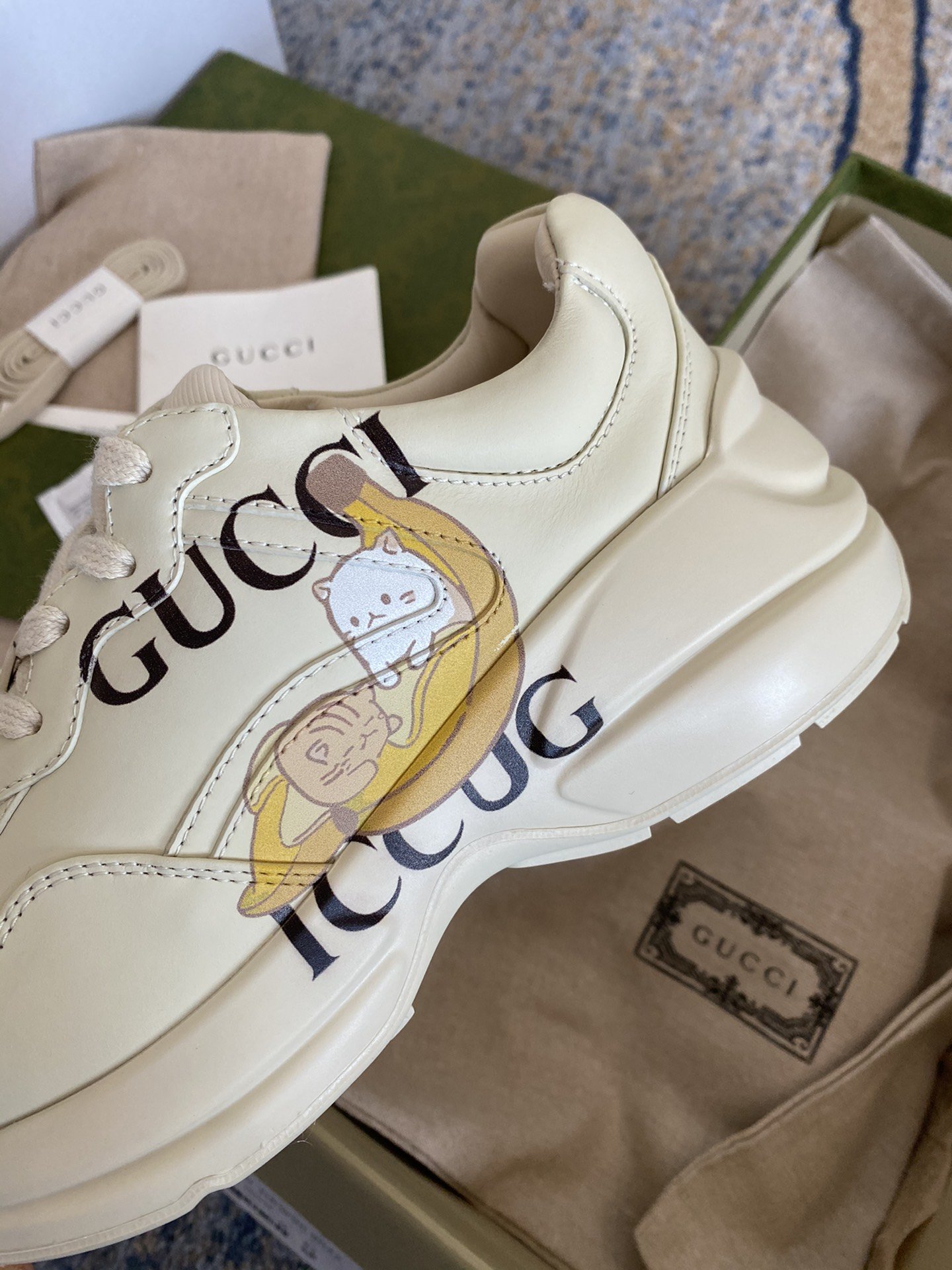 Bananya makes an appearance throughout the Ouverture collection celebrating the House's playful narrative that began six years ago. With dreams of becoming a fashionable chocolate-covered banana, the spirited cat is known for its charming pranks and friend-filled adventures. Here the cat animates this Rhyton sneaker, crafted primarily from Demetra. Created with the same processes used for tanning, the new material offers pliable and resilient performance with a supple finish. The eco-friendly material combines animal-free raw materials primarily from sustainable, renewable, and bio-based sources.