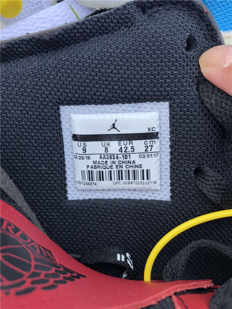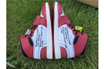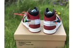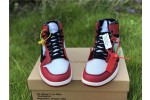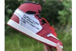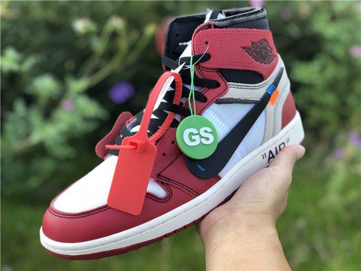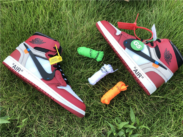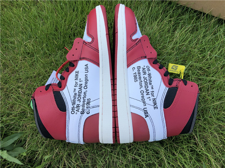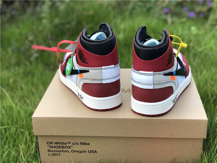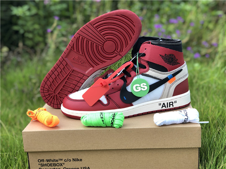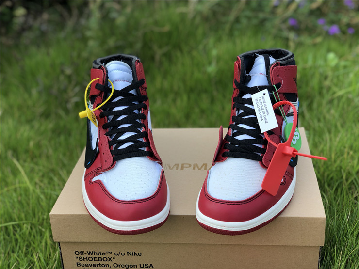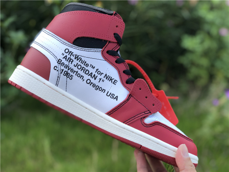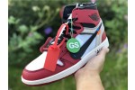This pair comes in the original Chicago-themed white, black and varsity red colorway. Featuring a white, red and black-based deconstructed leather upper with a Swooshless medial side branded with "Off-White for Nike Air Jordan 1, Beaverton, Oregon, USA © 1985." Other details include: floppy ankle collars with hidden “85” written on the inside, an oversized off-centered Swoosh on the lateral sides, "Air" written on the midsole and the word "Shoelaces" on the laces with no branding on the tongue.