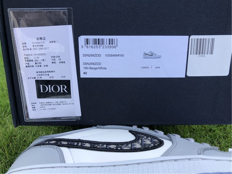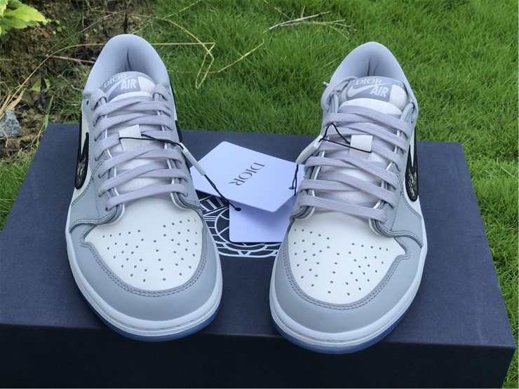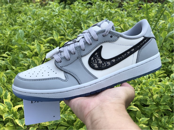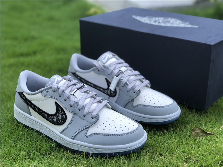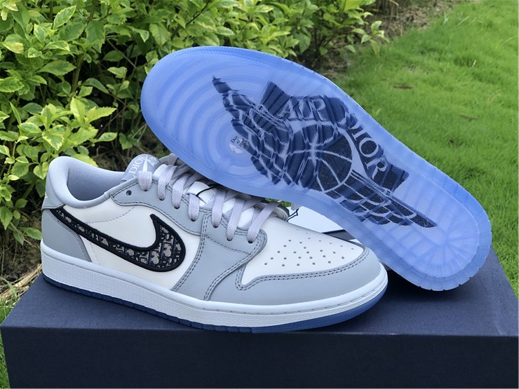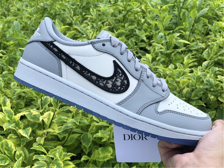 This Jordan 1 Retro Low is composed of a white and grey leather upper with traditional Dior monogram print Swoosh. Co-branded icy translucent soles, Dior branded tongue and Wings logo, and a silver “Air Dior” hang tag completes the design.