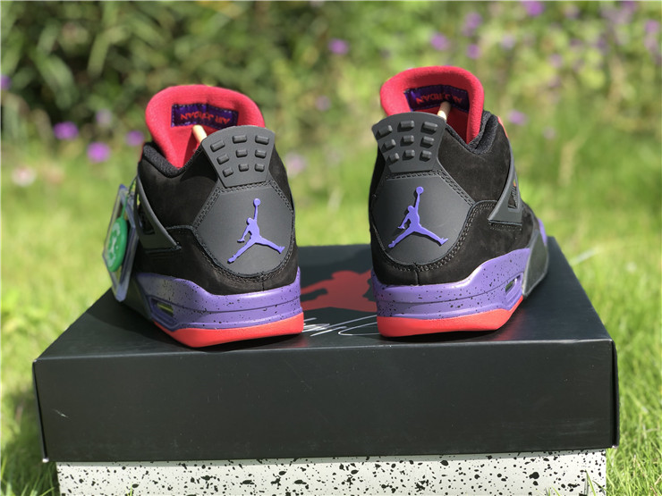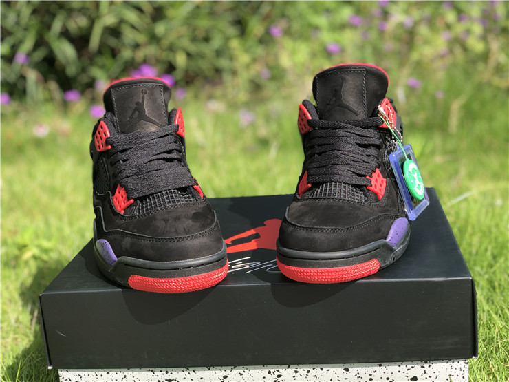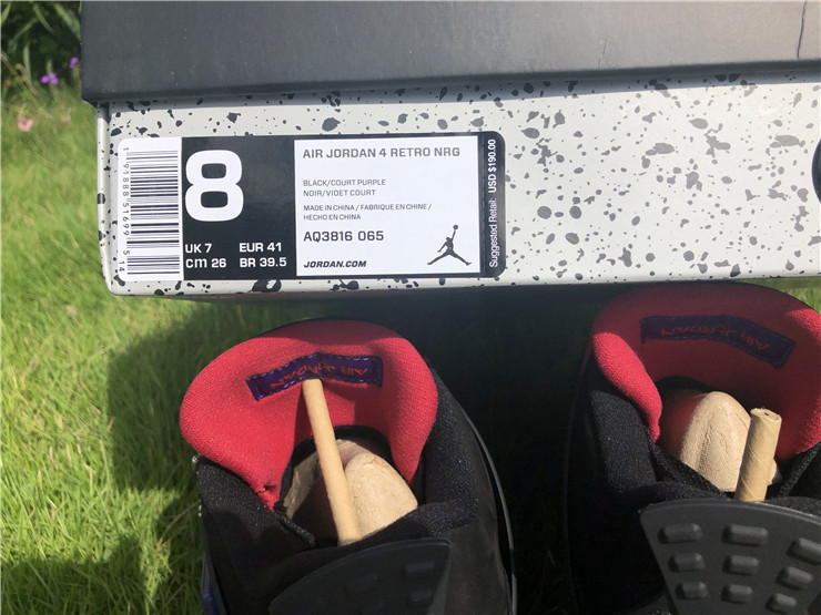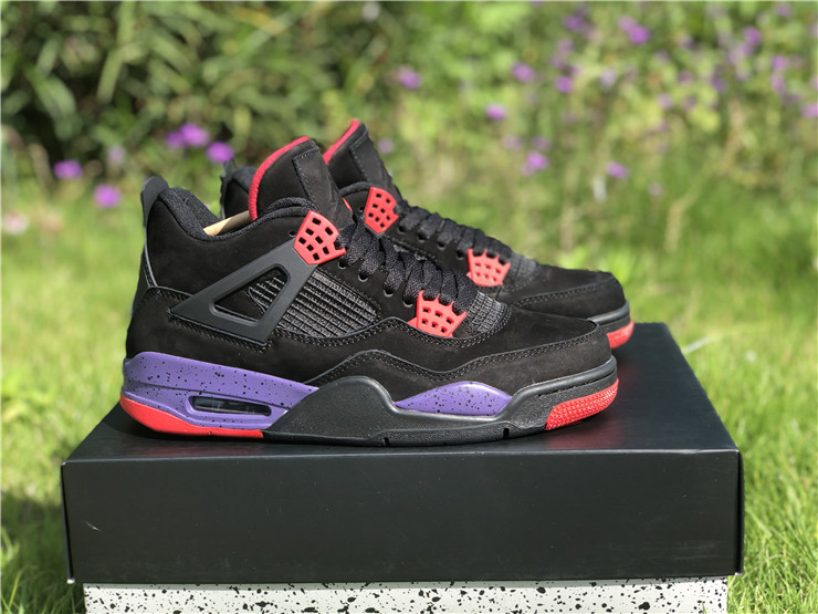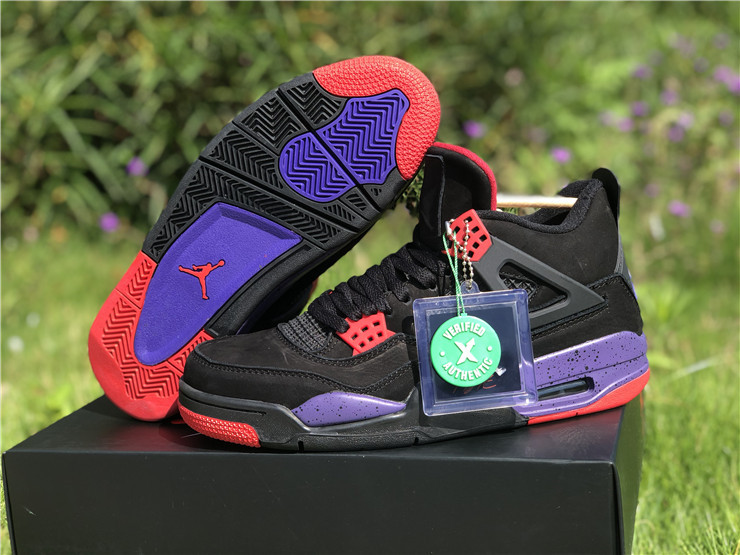 The Air Jordan 4 Retro NRG ‘Raptors - Drake Signature’ was a surprise launch on the SNKRS app in June 2019. Featuring the same colorway as the first 'Raptors' release, the main difference in this version is the patch on the tongue. Featuring a purple Jumpman logo and Drake's signature below in red, these match up even more with the Toronto Raptor team colors. The rest of the shoe is similar to the previous version: the upper features black nubuck, with University Red and Court Purple details throughout the shoe.